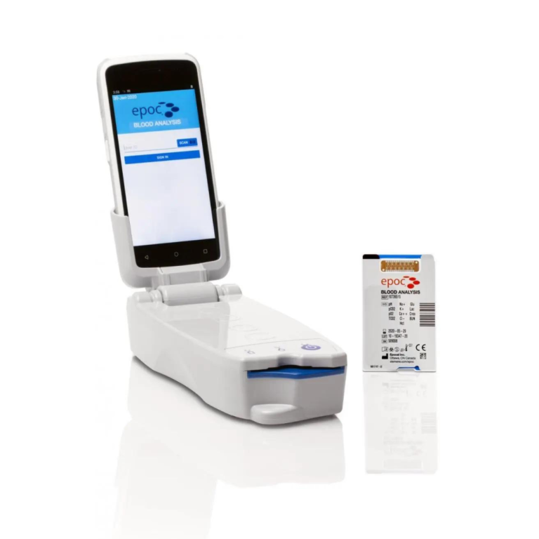 El sistema EPOC es una solución inalámbrica de mano que permite realizar pruebas de análisis de sangre integrales al lado del paciente en una tarjeta que se almacena a temperatura ambiente y con resultados en menos de un minuto.